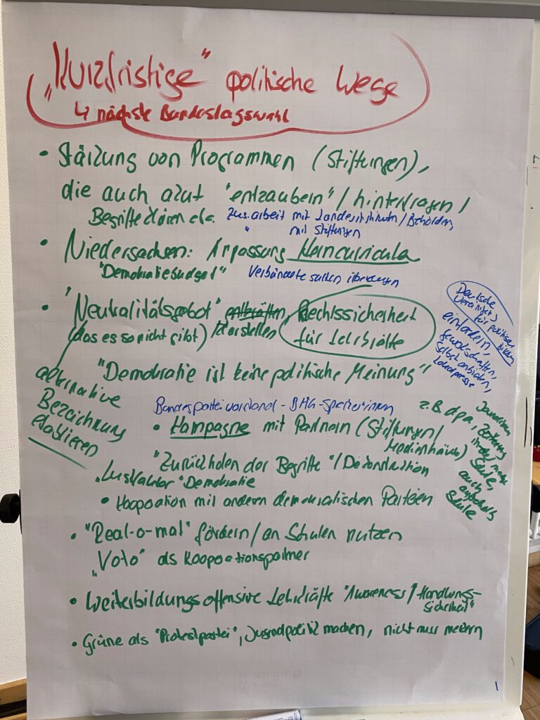Der Samstag widmete sich dem Schwerpunktthema Demokratiebildung in der Schule. Dr. Wolfgang Beutel, (Institut für Didaktik der Demokratie an der Leibnis Universität Hannover) betonte in seinem Input, dass die Schule prodemokratische Haltungen vermitteln müsse und eine demokratische Kultur nur durch mehr Partizipation der Schüler*innen an substanziellen Entscheidungen gelinge. Er forderte Investitionen in eine starke Lehrerbildung und eine klare Haltung der Schule zur Verteidigung der FDGO anstelle einer strikten Neutralitätspflicht.